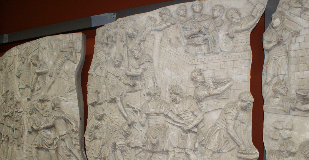 Un caso particolare è rappresentato dai calchi della Colonna Traiana realizzati negli anni 1861/1862 e conservati nel Museo della Civiltà Romana: alcuni di questi (insieme ad altro materiale proveniente dallo stesso Museo) sono esposti nella mostra “Traiano. Costruire l’Impero, creare l’Europa”. La Colonna è un monumento di straordinario valore artistico, ma anche storico perché testimonia le gesta (le due campagne militari per la conquista della Dacia, l’odierna Romania) di un grande imperatore come Traiano. Purtroppo, lo stesso monumento è tanto importante quanto ‘sfuggente’ visivamente, perché le leggendarie imprese di Traiano ben presto eludono lo sguardo del visitatore per correre verso il cielo, lungo le 23 volute elicoidali della Colonna. Al contrario, in virtù della loro natura e disposizione spaziale, i calchi offrono senza soluzione di continuità una fruizione ravvicinata, dettagliata e completa del ‘racconto’ della Colonna che non è possibile effettuare sul monumento originale.