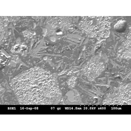 Immagine al microscopio elettronico a scansione del cemento a strätlingite