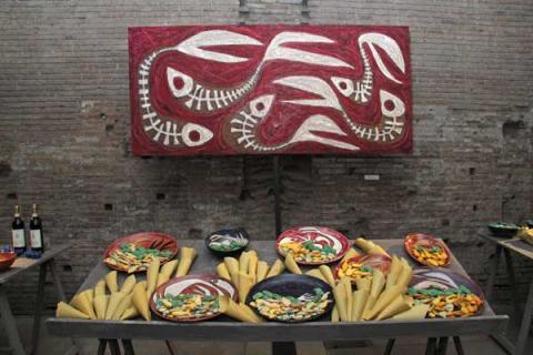La mostra ha molte contaminazioni, rispecchia l'aspetto poliedrico dell'artista, scultore, pittore scenografo ma anche attore e doppiatore.