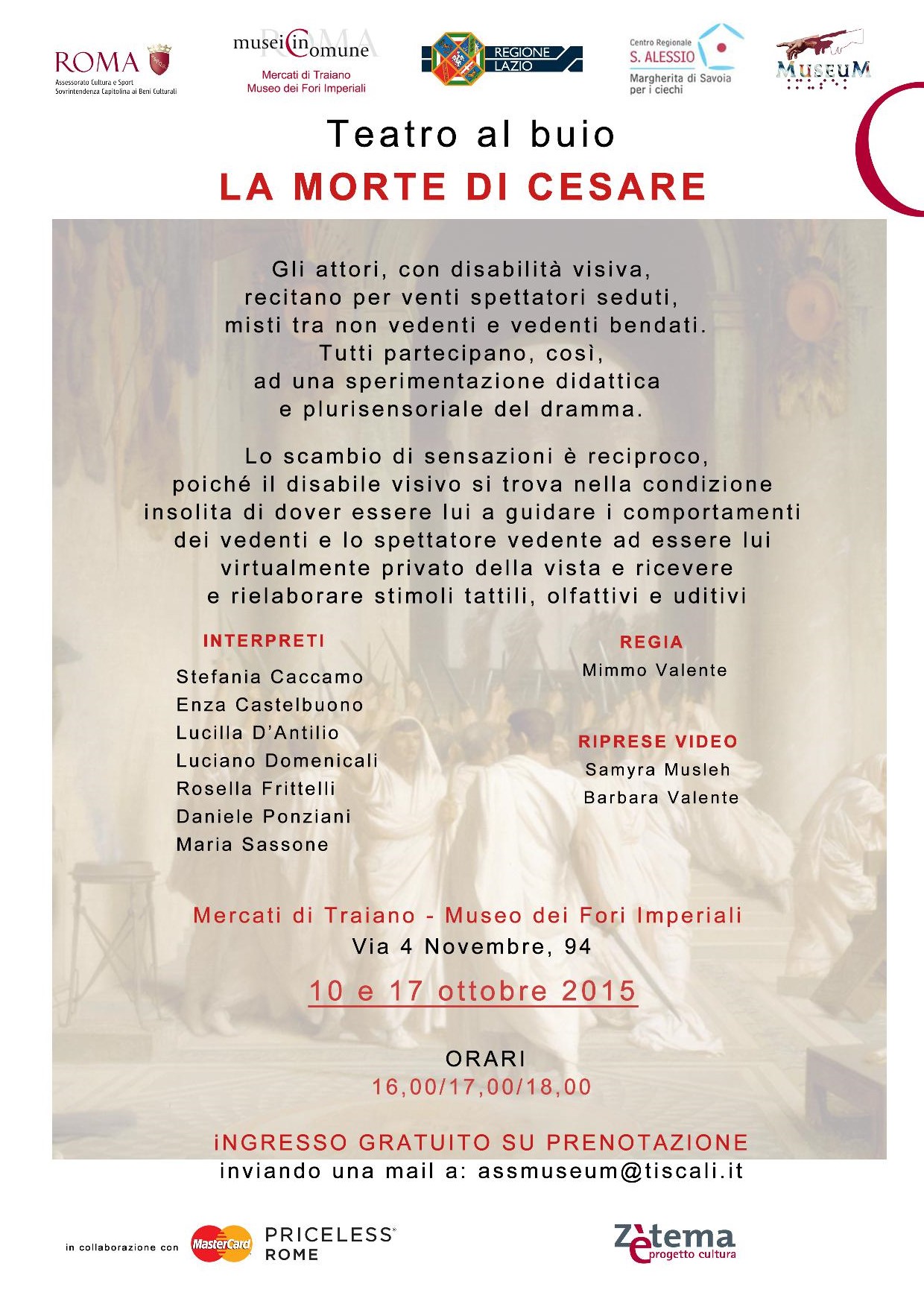 L’evento, che ambienta un dramma della storia antica di Roma in uno dei suoi monumenti più suggestivi, viene riproposto sotto forma di “teatro al buio”, in un linguaggio sperimentale che cala gli spettatori “vedenti” nella condizione di “non vedenti” e ne affina la percezione attraverso gli stimoli uditivi, olfattivi e tattili offerti dagli attori con disabilità visiva.